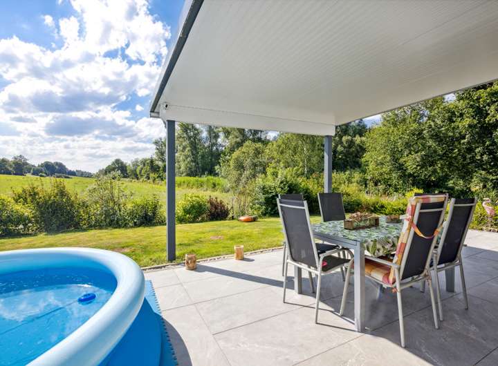 Von hier aus gelangen Sie auf die sonnige und überdachte Terrasse sowie in den gepflegten Garten mit integriertem Spielplatz. Hier können die Kinder spielen und Sie die Ruhe und den Weitblick genießen. Entspannen und den Alltag hinter sich lassen.