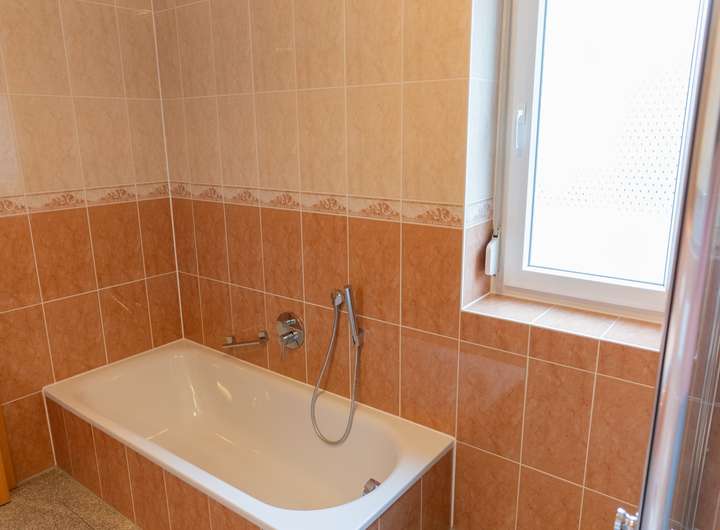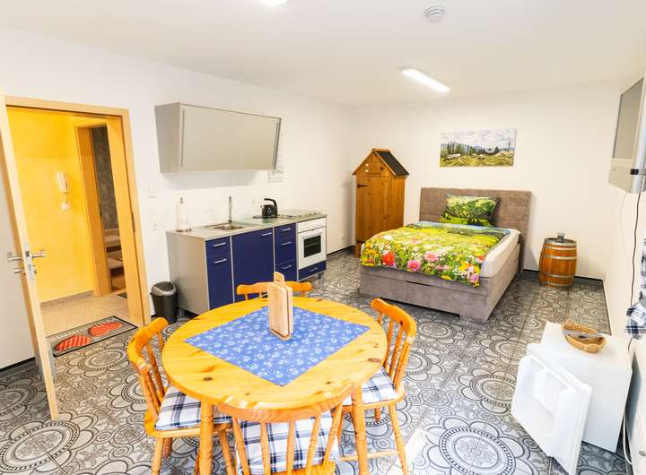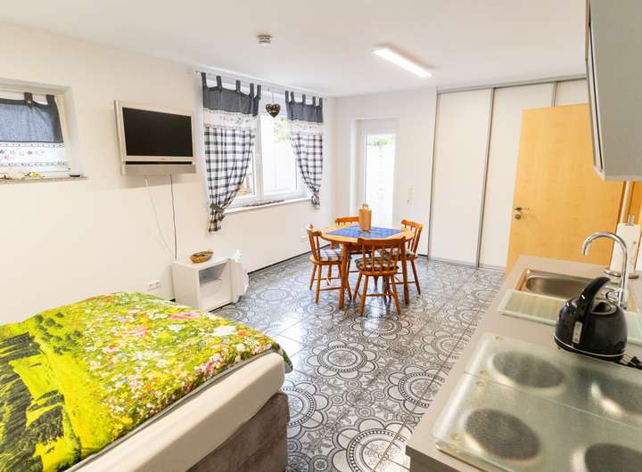 Das KG ist vollunterkellert und bietet 1-Zimmer-Apartment mit Singleküche, Bad mit Duschwanne und WC sowie einer kleinen Terrasse.