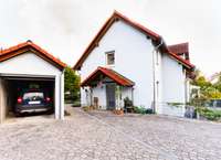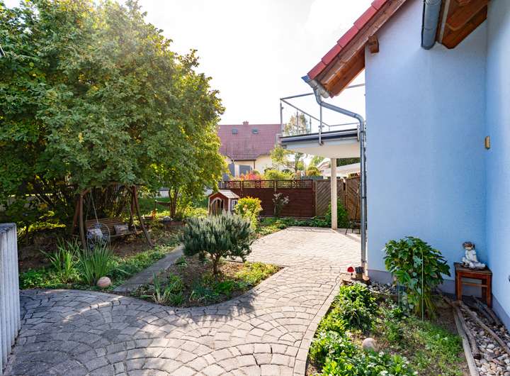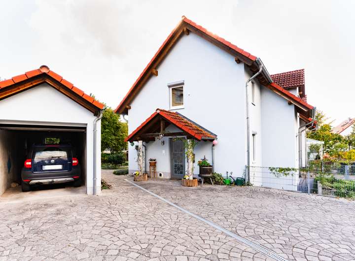 Ein Garten mit Blumen-, Kräuter- und Sträucherbestand ist vorhanden. Zur Immobilie gehören eine Garage sowie vier weitere Stellplätze (davon ein kleiner). Die Zufahrt ist sehr breit; die Stellplätze sind praktisch angeordnet (Garage, ein Platz davor, zwei daneben plus kleiner Stellplatz).