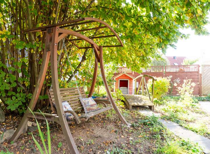 Eine Zisterne mit Wasserhahn-Anschluss zur Gartenbewässerung ist vorhanden.
