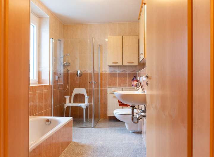 Das EG ist barrierefrei nutzbar (u. a. breitere Türen) und umfasst 3 Zimmer, Küche, Abstellraum und Tageslichtbad mit bodengleicher Dusche, Wanne und WC sowie eine Terrasse.