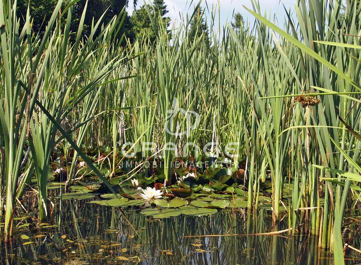 Umgeben von Gärten mit Bungalows befindet sich in der Mitte des Grundstücks der ca. tausend Quadratmeter große Teich: Schilf, Seerosen, Frösche – Idylle pur unter einer riesigen Weide.