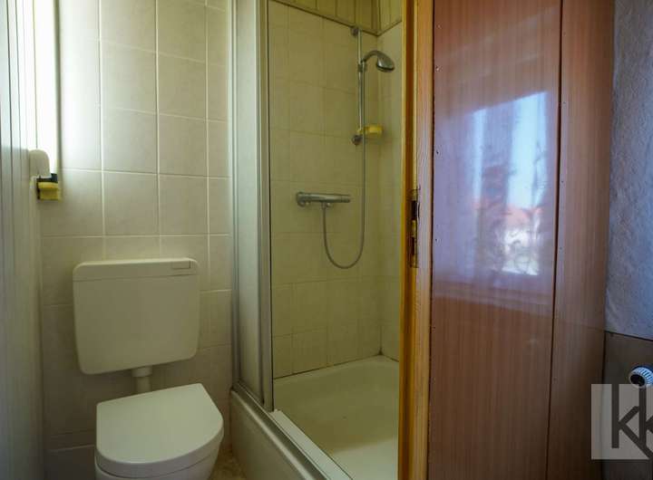 Von hier aus gelangen Sie zentral in das Badezimmer, das mit einer Dusche ausgestattet ist und die Küche.