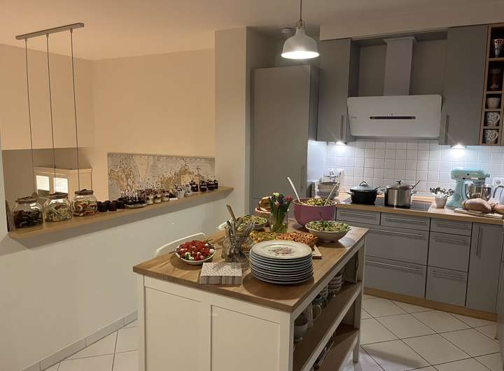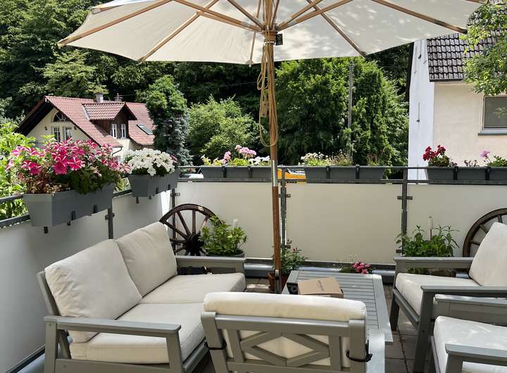 Über das Zwischengeschoss mit dem Heizungsraum und ausreichend Nutzfläche erreichen Sie anschließend die Wohnebene mit dem großen und hellen Wohn-Essbereich. Die ein halbes Stockwerk höher gelegene, helle, moderne und mit neuen Geräten ausgestattete Küche ist zum Wohnbereich hin offen. Von der Küche haben Sie auch Zugang auf eine weitere Terrasse mit Zugang in den terrassenartig angelegten Garten mit einem separaten, sonnigen Freisitz.