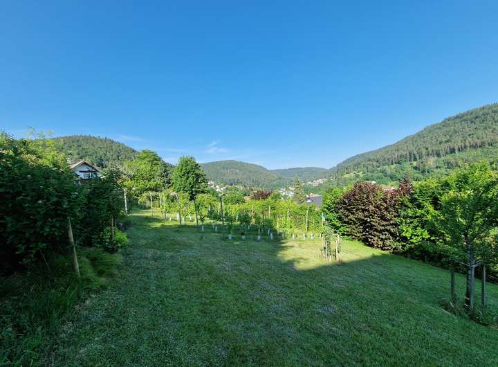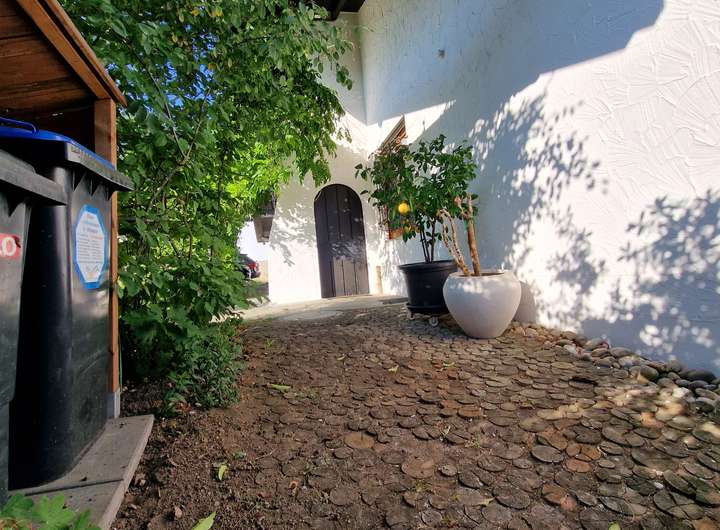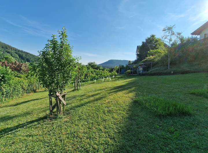 Das beeindruckende Grundstück von 1642 m² kann in zwei Teilstücke von 860 m² und 782 m² unterteilt werden. Der Garten verfügt über einen ca. 100 m² großen Weingarten und einen unterirdischen Regenwasserspeicher von etwa 10.000 Litern. Ein über 11 Meter langer Balkon erstreckt sich entlang der Rückseite des Hauses und bietet einen atemberaubenden Blick auf die umliegende Landschaft.
