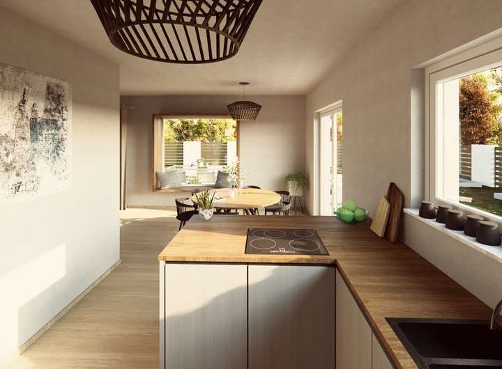 Zeitlose Eleganz von außen, großzügiger Raum und ein besonderes Raumgefühl von innen - das zeichnet unser Design 10 aus. Unter dem Satteldach erwarten etwa 135 m² auf zwei Ebenen darauf, bezogen und mit Leben gefüllt zu werden. Im Erdgeschoss steht Offenheit im Mittelpunkt: Der großzügige Wohn-Ess-Koch-Bereich erstreckt sich fast über die gesamte Ebene und wird lediglich durch die zentral platzierte Treppe von der Diele getrennt. Das Ergebnis ist ein heller, einladender und großzügiger Raum, ideal zum Wohlfühlen und Zusammenkommen. Im Eingangsbereich befinden sich zudem ein kleines Gäste-WC sowie ein großer Hauswirtschaftsraum. Über die mittig platzierte Treppe gelangt man ins Obergeschoss. Hier gibt es ausreichend Platz für Eltern und bis zu zwei Kinder. Die Eltern genießen ein großzügig gestaltetes Schlafzimmer mit separatem Ankleideraum, während zwei große Kinderzimmer ebenfalls keine Wünsche offenlassen. Das Raumangebot in der oberen Etage wird durch ein geräumiges Badezimmer mit Dusche, Badewanne und WC abgerundet.