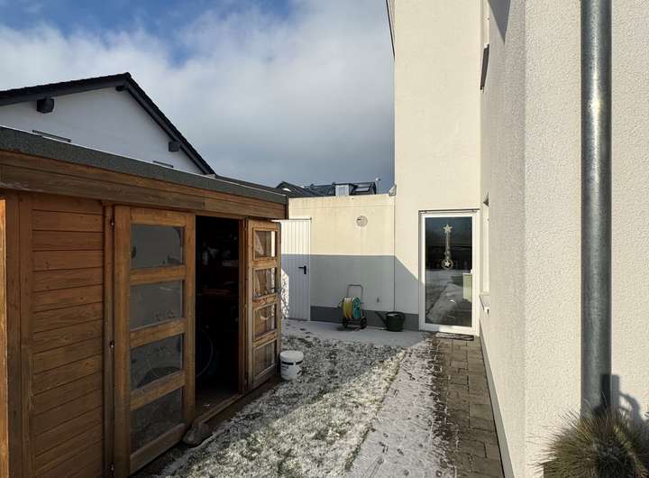 Die auf den Fotos abgebildete Terrassenüberdachung und das Gartenhaus befinden sich im Eigentum des aktuellen Mieters und können eventuell übernommen werden. Für die Nutzung der Garage fällt eine monatiche Nutzungsgebühr in Höhe von 60,-€ an. Diese sind in der Warmmiete bereits enthalten. Die Nebenkosten Heizung (Gas), Strom und Telekom werden zusätzlich über die Versorger abgerechnet.