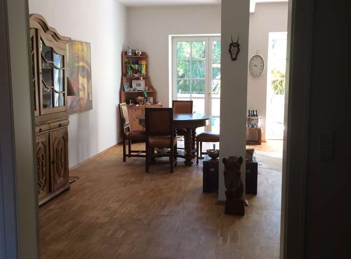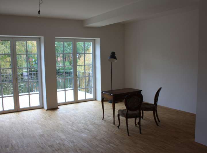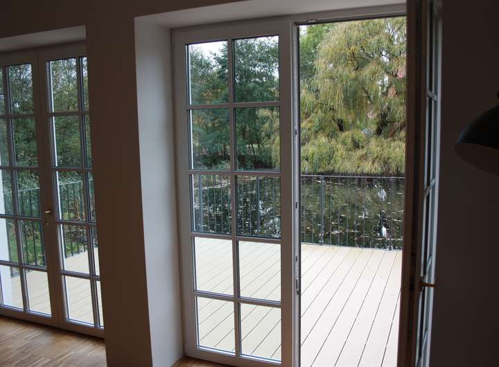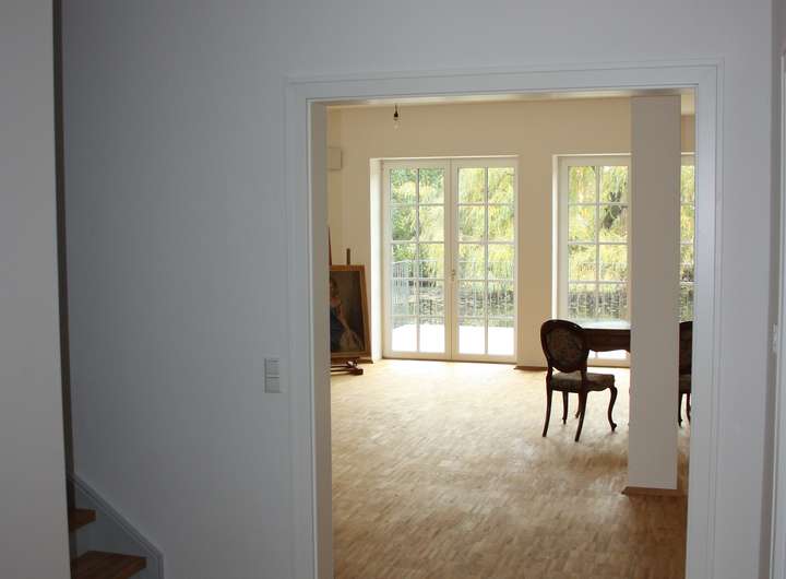 - ein phänomenales Wohnzimmer mit Panoramafenstern auf die große Terrasse, die sich auf der Teichseite erstreckt (Südseite).