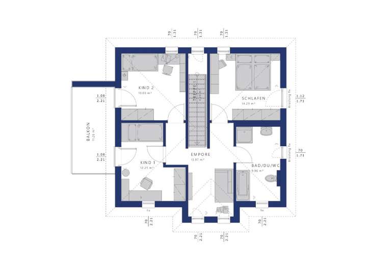 Alles in bester Ordnung ist auch oben. Eine kuschelige Empore erschließt hier drei Zimmer für die Eltern und zwei Kinder,