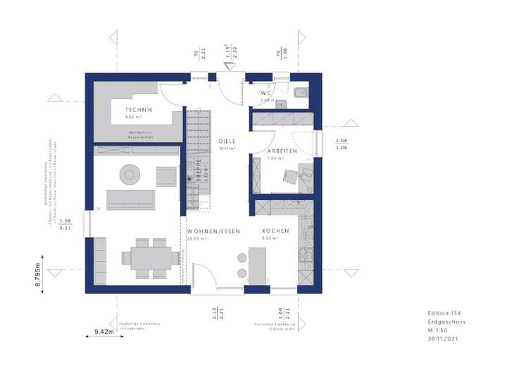 unten die Küche vom Ess- und Wohnbereich ab, zusätzlich gibt es hier ein Arbeitszimmer, Gäste-WC und den Technikraum.