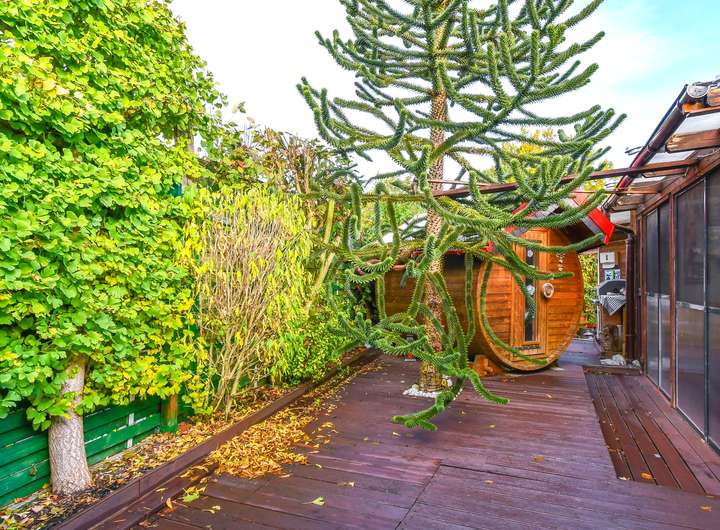 Der gepflegte und nicht einsehbare Gartenbereich ist ein besonderes Highlight: Eine hochwertige Fasssauna mit Außendusche schafft eine private Wohlfühloase – ideal für erholsame Stunden nach einem langen Tag.