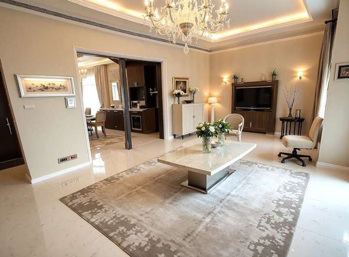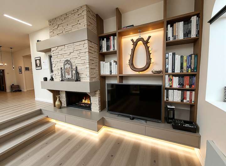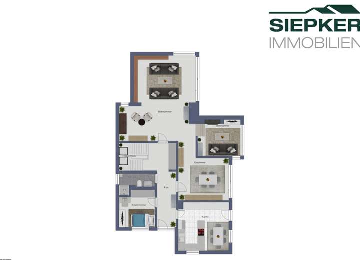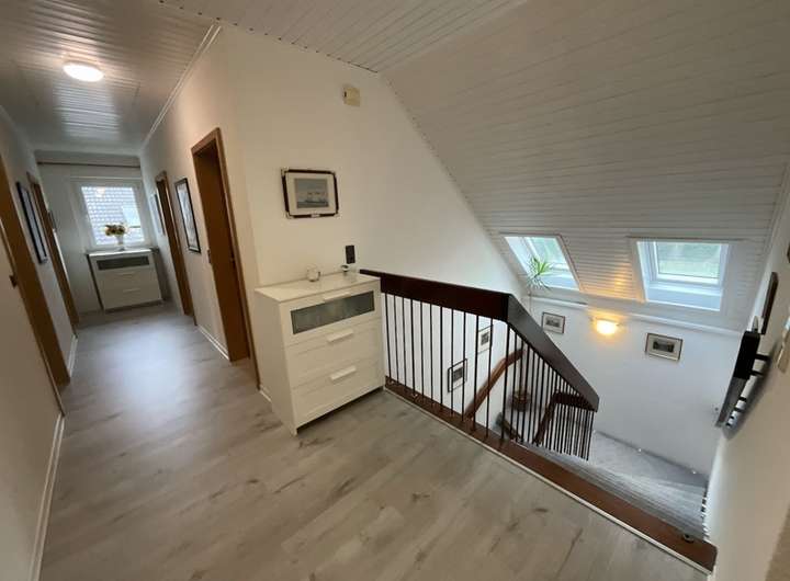 Der Eingangsbereich besticht durch einen Windfang und einen großzügigen Flur mit Garderobe. Auf dieser Ebene finden Sie ein Arbeits- oder Gästezimmer, ein Gäste-WC mit Duschmöglichkeit, sowie eine großzügige Küche mit Zugang zur Frühstücksterrasse. Das geräumige Esszimmer ist mit einer tiefergelegten Kaminecke ausgestattet, während der gemütliche Wohnraum direkten Zugang zur überdachten Südterrasse bietet.