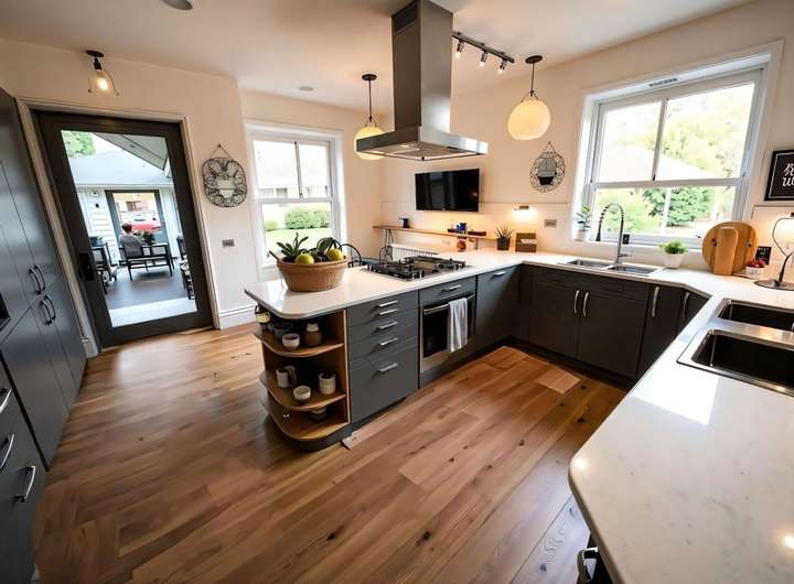 Die Wand zwischen Küche und Essbereich/ Kaminecke, könnte geöffnet werden, so dass Sie Ihre Küche zu einer Wohnküche verwandeln können.