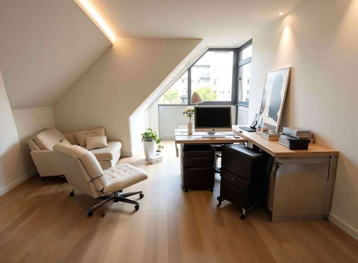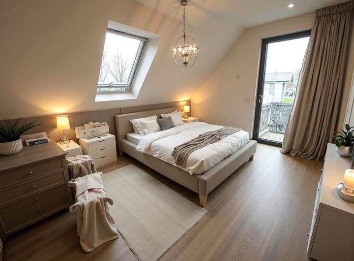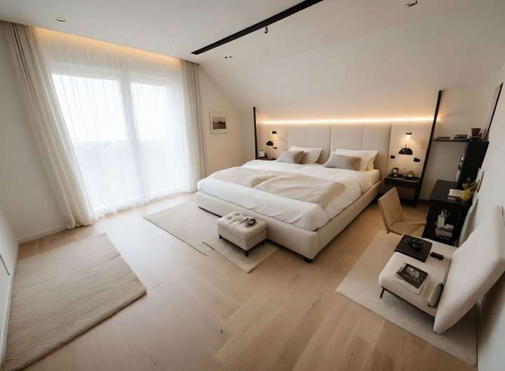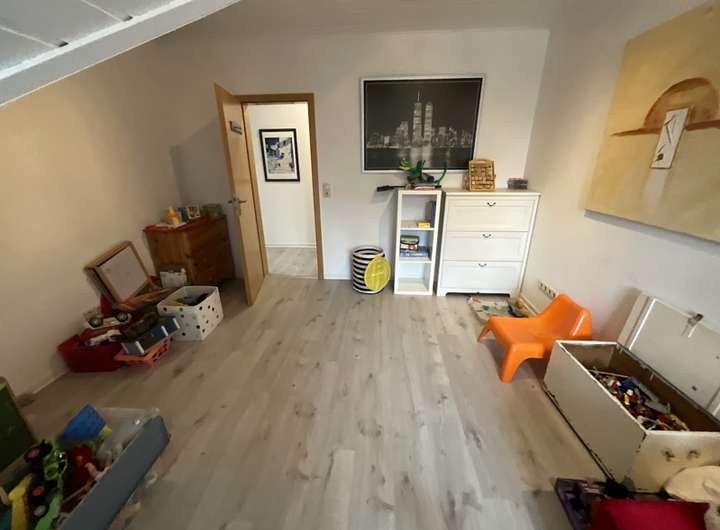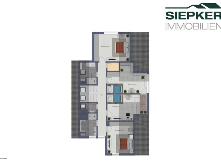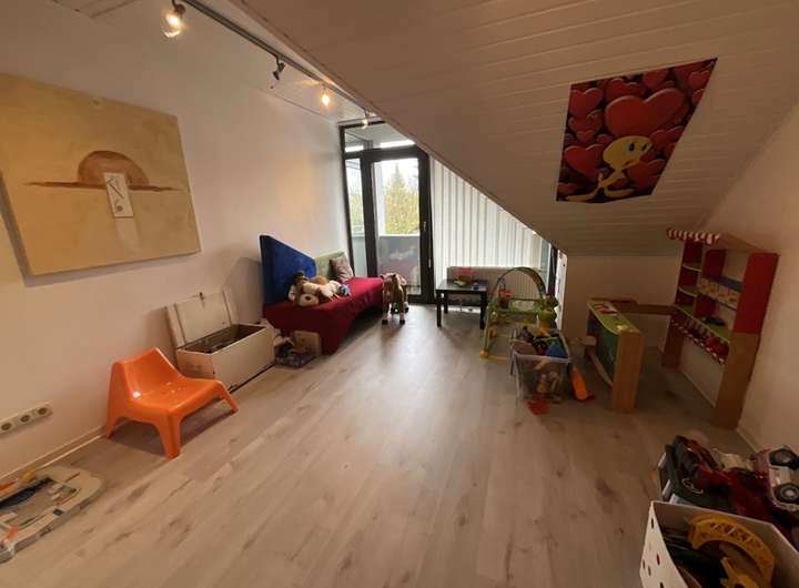 Das ausgebaute Satteldach bietet Platz für drei Kinderzimmer, ein Elternschlafzimmer, zwei Tageslicht-Badezimmer und ein separates WC. Ein Zimmer verfügt über Küchenanschlüsse, was die Möglichkeit eröffnet, hier eine kleine Einliegerwohnung zu schaffen. Die Schlafzimmer wurden überwiegend mit Teppichboden ausgelegt. Zwei Zimmer verfügen über einen Ausgang auf eine kleine Loggia.