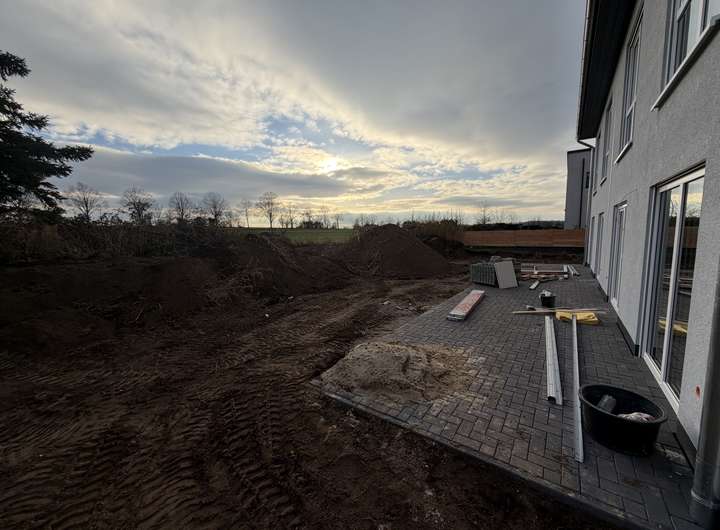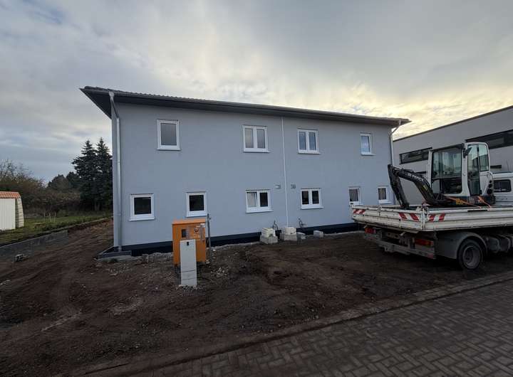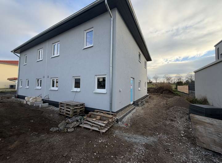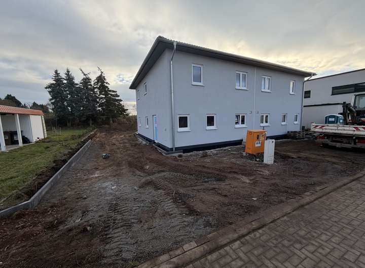 Diese moderne Neubau-Doppelhaushälfte vereint energieeffizientes Wohnen mit Komfort, Ruhe und bester Anbindung. Einkaufsmöglichkeiten sind fußläufig erreichbar, der Börde Park Magdeburg ist nur 10 Autominuten entfernt. Für Naturliebhaber liegen die Sohlener Berge in unmittelbarer Nähe und von Terrasse und Garten genießen Sie einen unverbauten Blick auf das freie Feld. Vor dem Haus befinden sich Stellplätze, die Platz für bis zu drei PKWs bieten. Abstellmöglichkeiten für Gartengeräte oder andere Utensilien stehen im Geräteschuppen oder auf dem Dachboden zur Verfügung. Der Anschlusspunkt für eine Wallbox ist bereits vorhanden, sodass diese bei Bedarf problemlos installiert werden kann. Ein Glasfaseranschluss ist vorhanden und ermöglicht schnelles Internet. Das Grundstück wird noch vollständig umzäunt, womit es von außen nicht mehr zugänglich ist und die Terrassen und Gärten der beiden Haushälften getrennt sind.