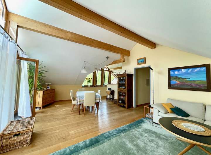 Im Obergeschoss befindet sich ein großes Wohnzimmer mit offener Küche und Balkon, ein weiterer großer Aufenthaltsraum mit überdachter Loggia, einem großzügigen Badezimmer, einem großen Schlafzimmer mit anschließendem Ankleidezimmer und einem kleinen Lesezimmer mit Zugang auf den Carport.