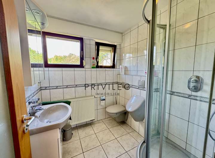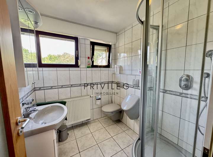 Insgesamt verfügt die Immobilie über drei helle Tageslichtbäder. Ein Keller mit Waschraum, ein Hobbyraum, eine Garage mit ca. 27 m² sowie ein Schuppen mit ca. 19 m² und ein zusätzlicher Werkstatt- oder Gartengeräteraum sorgen für ausreichend Abstellmöglichkeiten. Außerdem stehen genügend Freiflächen für weitere Stellplätze zur Verfügung.