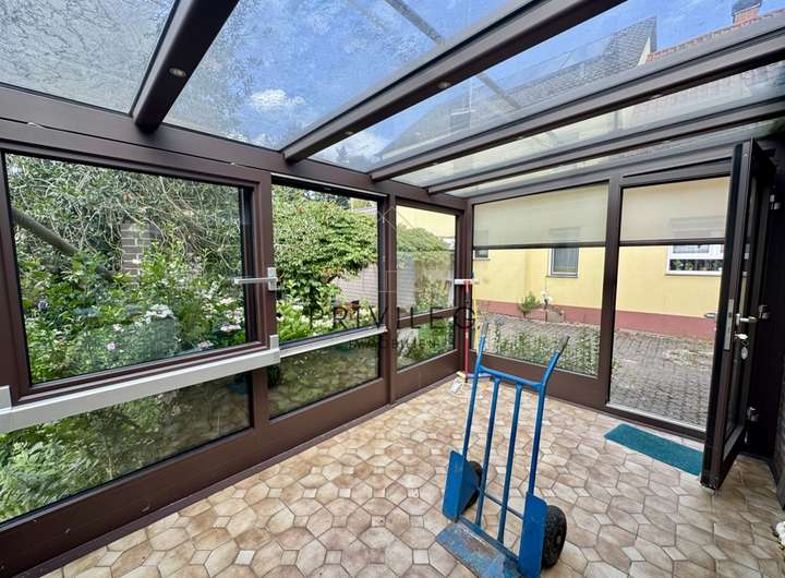 Im Erdgeschoss finden Sie ein Schlafzimmer, ein Wohnzimmer, ein Bad, eine Küche sowie ein Esszimmer mit direktem Zugang zum beheizten, neuwertigen Wintergarten (Baujahr 2020) mit dimmbarer Beleuchtung und elektrischen Rollläden.