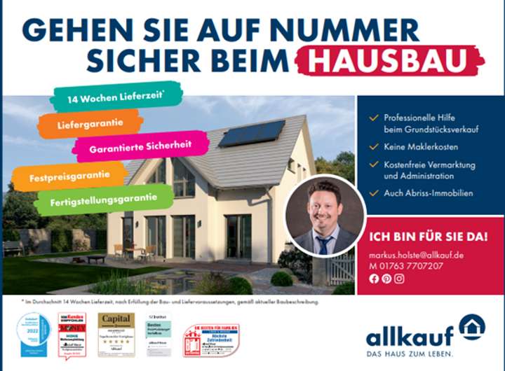 Mit allkauf entscheiden Sie sich nicht nur für ein individuelles Zuhause, sondern auch für Sicherheit, kurze Lieferzeiten sowie garantierte Fertigstellung. Vereinbaren Sie noch heute Ihren Termin zur Planung Ihres allkauf Traumhauses!