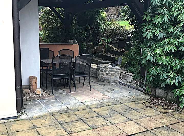 Terrassenförmig angelegte Außenanlage mit Rasen, einem großzügigen Gartenhaus, Hoffläche, Holzlagerhaus, PKW-Stellplätze, Carport.