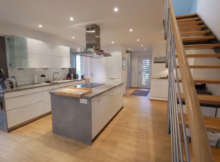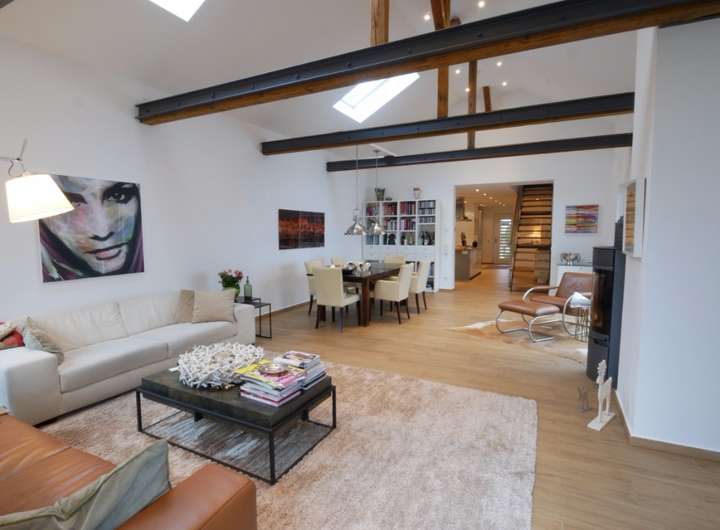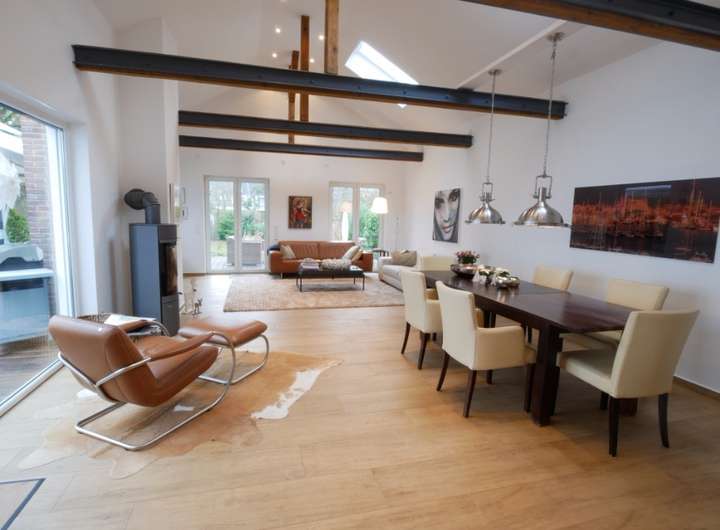 Der Anbau besticht durch seinen einmaligen Loftcharakter und ist der Mittelpunkt des Hauses. Die Zwischendecke wurde aufwendig entfernt und zwei große, elektrische Dachfenster durchfluten den ca. 50 m² großen Lebensraum mit zusätzlichem Tageslicht. Die Fußbodenheizung ist unter den warmen Echtholzfliesen verlegt und erstreckt sich über dem gesamten Erd- und Obergeschoss. Ein Kaminofen im Wohnzimmer sorgt zusätzlich für behagliche Gemütlichkeit.