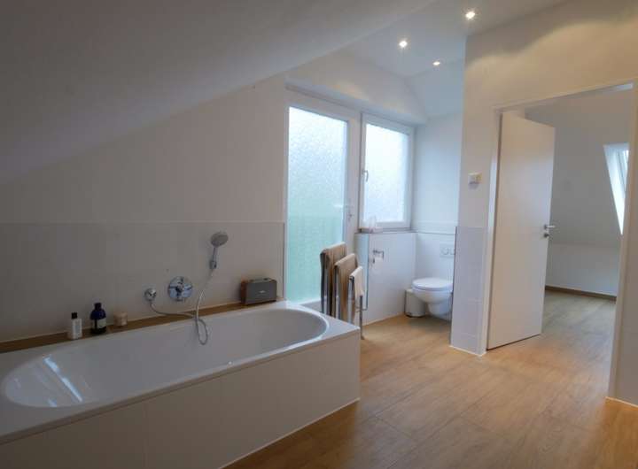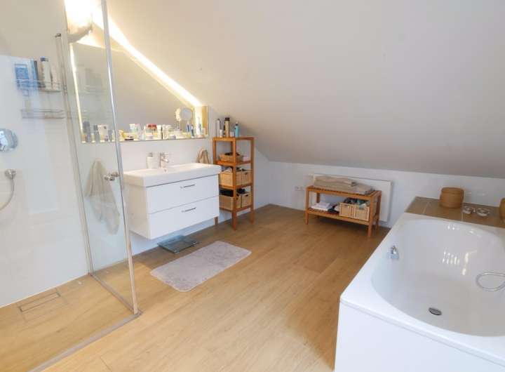 Hier erwarten Sie das Masterschlafzimmer mit Ankleidebereich und ein Wellness-Bad, der seinen Namen wirklich verdient hat. Dieses Bad, mit tiefer gelegter Badewanne, bodentiefer Dusche und diskretem WC-Bereich, ist ein Ort zum Verweilen und genießen - das Beste ist eben gut genug für Sie!
