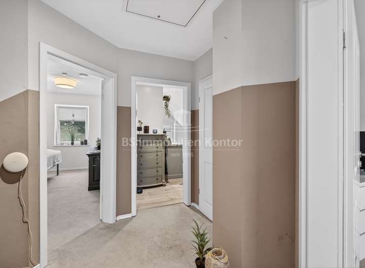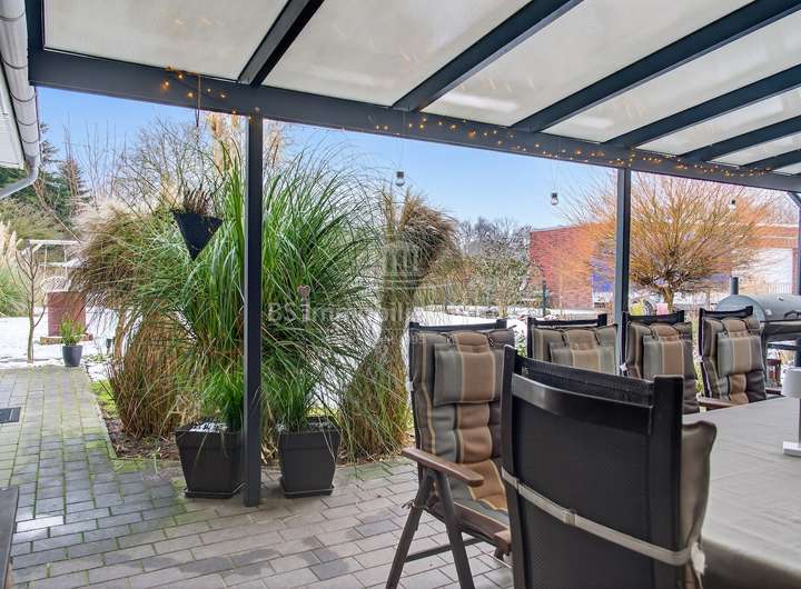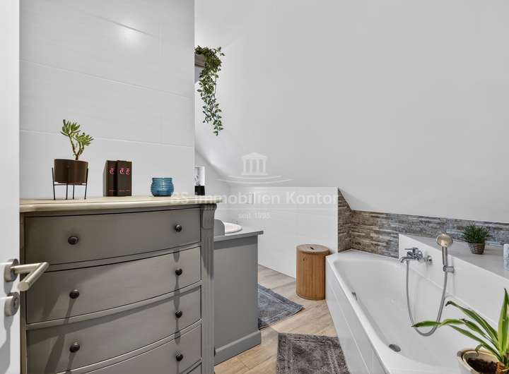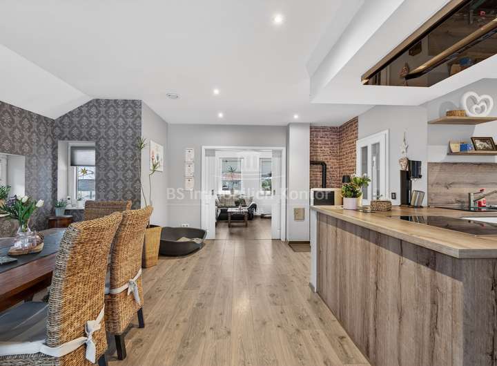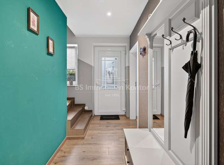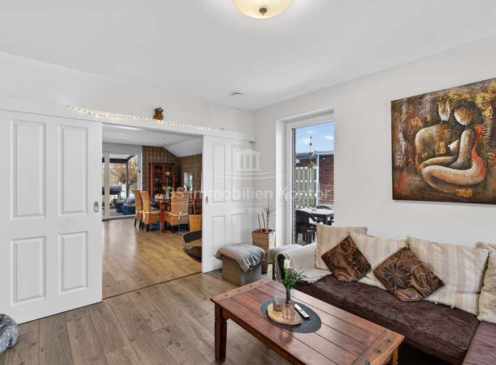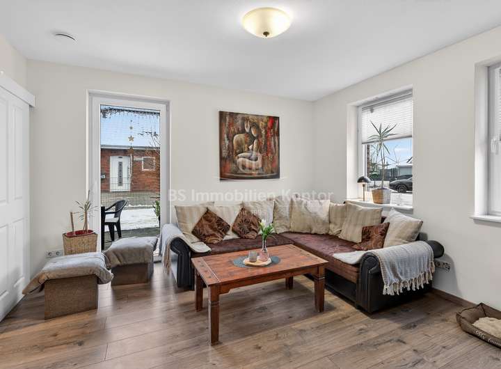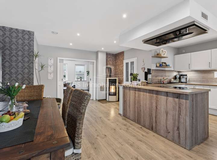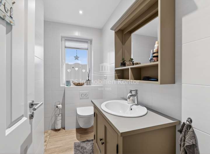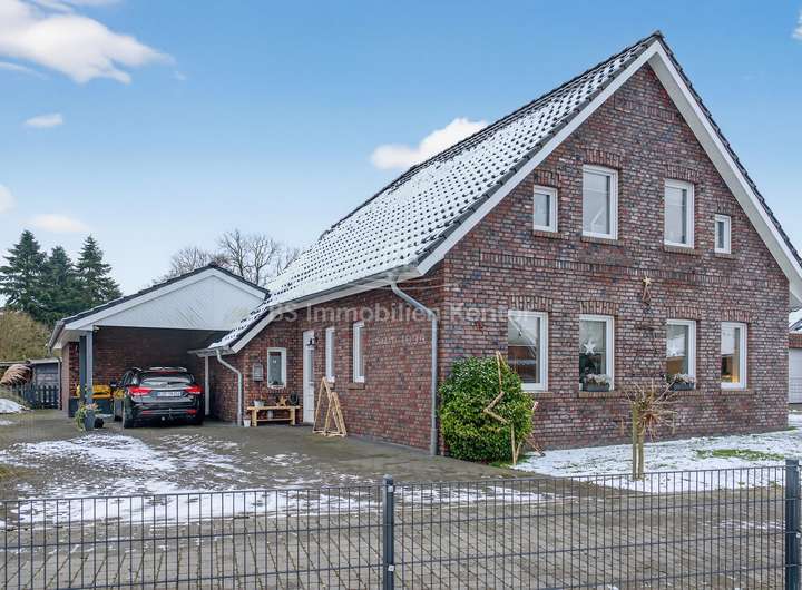Dieses 2018 erbaute Einfamilienhaus in ruhiger Sackgassenlage von Rhauderfehn/Langholt besticht durch seine moderne Architektur, hochwertige Ausstattung und nachhaltige Haustechnik. Das großzügig geschnittene Grundstück verfügt über eine Fläche von ca. 898 m² und bietet damit viel Platz für individuelle Gestaltungsmöglichkeiten. Im Erdgeschoss erwartet Sie einen hellen, offenen Küchen- und Essbereich, der den Mittelpunkt des Wohnens bildet. Der angrenzende Wohnbereich ist durch eine elegante Schiebetür abtrennbar. Ergänzt wird das Raumangebot durch ein Büro, ein Gäste-WC mit Dusche sowie einen Hauswirtschaftsraum mit Zugang zu einem massiv gebauten Hobbyraum mit sep. Eingang und WC, der vielseitige Nutzungsmöglichkeiten bietet. Die überdachte Terrasse lädt zum entspannten Verweilen im Freien ein.