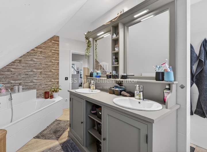 Im Obergeschoss befinden sich drei Schlafzimmer sowie ein großzügiges Vollbad mit Wanne, Dusche, Doppelwaschbecken und WC. Besonders hervorzuheben ist die moderne Haustechnik: Solarkollektoren sorgen für die Warmwasserbereitung und Heizungsunterstützung. Ergänzend dazu trägt eine leistungsstarke Photovoltaik-Anlage zur umweltfreundlichen Stromerzeugung bei. Die Immobilie wird durch eine Pelletheizung beheizt (wirtschaftliche Energieversorgung). Eine KNX-Bussystem-Vernetzung ermöglicht die intelligente Steuerung sämtlicher Haus- und Gebäudesystemtechnik.. Abgerundet wird das Angebot durch einen praktischen Carport.