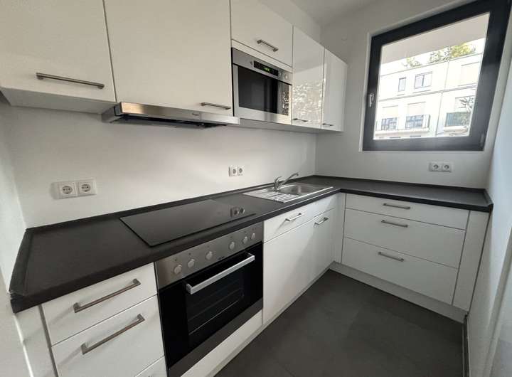 Die vorhandene Einbauküche ist funktional ausgestattet und verfügt über helle Ober- und Unterschränke, eine integrierte Spüle, einen vollintegrierten Geschirrspüler, Cerankochfeld mit Backofen, Mikrowelle, Umluft-Dunstabzug sowie einen Hochschrank mit Kühl- und Gefrierkombination.