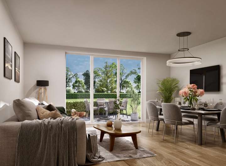 Herzstück des Hauses ist der offen gestaltete Wohn-, Ess- und Kochbereich im Erdgeschoss, der durch bodentiefe Fenster nahezu im gesamten Haus viel Tageslicht und ein angenehmes Wohngefühl bietet. Der direkte Zugang zur Terrasse mit angrenzendem Garten schafft fließende Übergänge zwischen Innen- und Außenraum – ideal für entspannte Stunden im Grünen. Ein Gäste-WC sowie ein praktischer Hauswirtschaftsraum komplettieren das Raumangebot auf dieser Ebene.