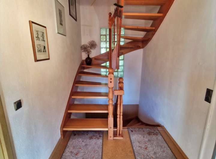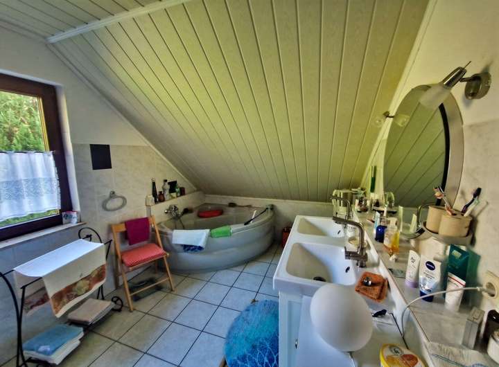 Im Dachgeschoss befinden sich drei weitere Wohnräume sowie ein Badezimmer mit Badewanne und ein Flur, der die Räume miteinander verbindet.