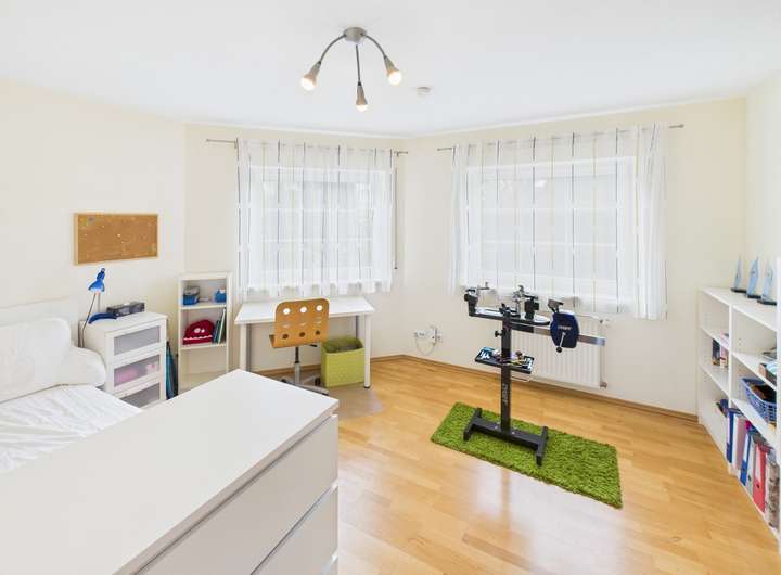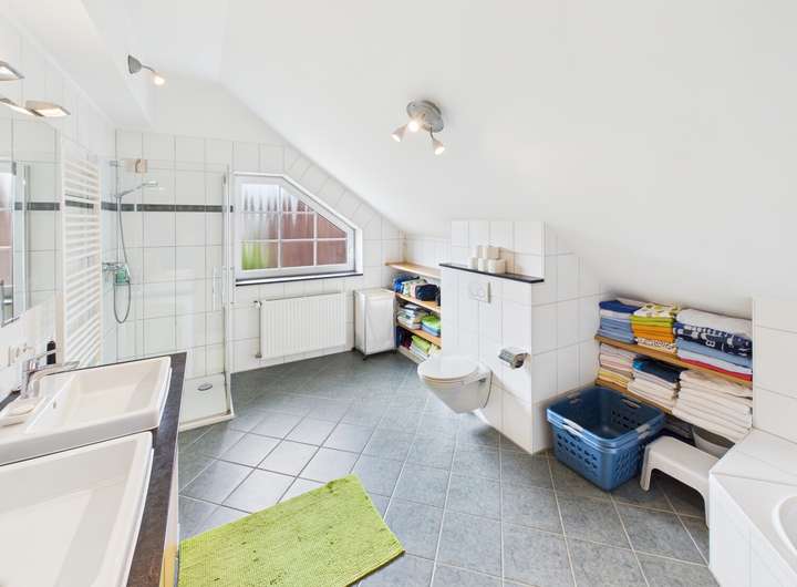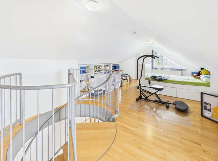 Über eine moderne Treppe gelangt man ins Obergeschoss, das vier geräumige Zimmer sowie ein stilvolles Badezimmer mit Badewanne, einer ebenen Dusche und Doppelwaschtisch bereithält. Hier finden alle Familienmitglieder ihren persönlichen Rückzugsort. Ein weiteres Highlight ist das Dachgeschoss: ein lichtdurchflutetes Zimmer mit eigenem Tageslichtbad, das sich perfekt als Atelier, Jugendbereich oder Gästeetage eignet.