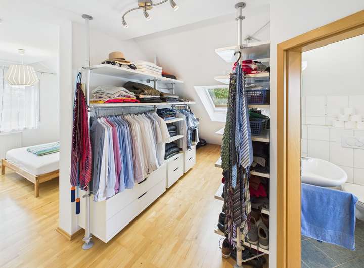Das Erdgeschoss überzeugt zudem mit einem flexibel nutzbaren Bereich, der derzeit als Ankleideraum mit angeschlossenem Schlafzimmer und eigenem Duschbad gestaltet ist. Ob als Gäste-, Arbeits- oder Hobbyzimmer – dieser Rückzugsort lässt sich individuell an die Bedürfnisse seiner Bewohner anpassen und sorgt für zusätzlichen Komfort.