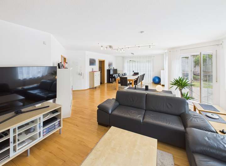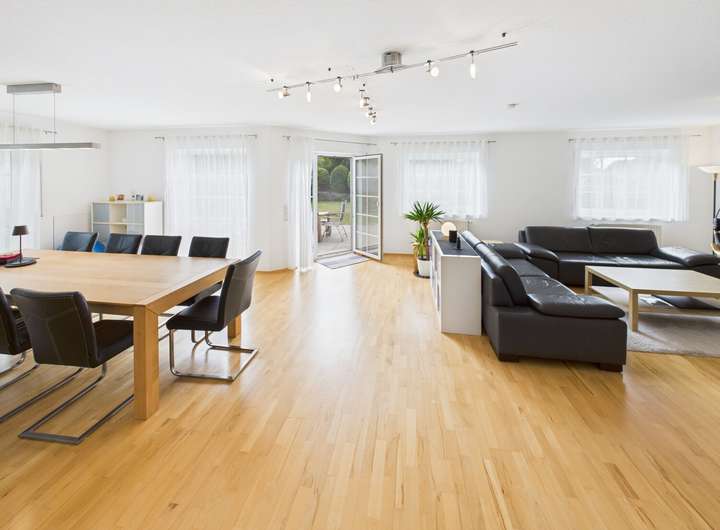 - Großzügiger Wohn- und Essbereich mit großen Fensterfronten und Zugang auf die Sonnenterrasse
