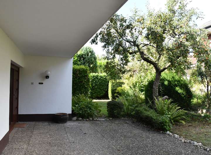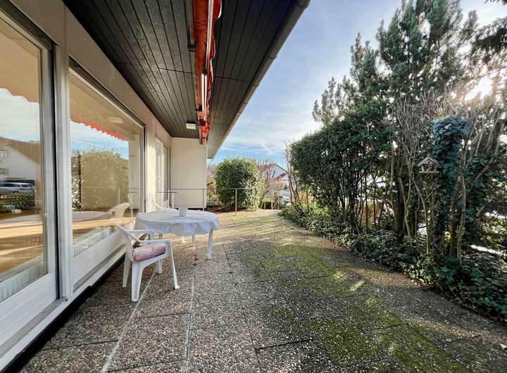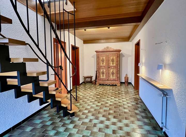 Über eine Treppe erreichen Sie das Erdgeschoss. Durch das Esszimmer hindurch kommen Sie in die Küche mit einer angrenzenden Speisekammer. Viel Atmosphäre und Helligkeit erwartet Sie im großen Wohnzimmer - dem Herzstück des Hauses - mit dem Ausgang zur blickgeschützten Südterrasse. Drei weitere helle Zimmer sowie ein Badezimmer mit bodengleicher Dusche, ein Gäste WC sowie ein großer überdachter Balkon runden das Raumangebot auf einer Ebene perfekt ab.