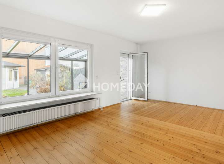 Durch den einladenden, hellen Eingangsbereich gelangen Sie in den Flur, der den Blick direkt auf das großzügige Wohnzimmer freigibt. Warme Holzdielen verleihen dem Raum eine wohnliche Ausstrahlung und reflektieren das natürliche Licht, das durch die großen Fenster einfällt. Von hier aus öffnet sich der Übergang in den Wintergarten, ein echtes Highlight. Die bodentiefen Glasfronten lassen den Innenraum nahtlos in den Garten übergehen. Stellen Sie sich vor, wie Sie hier Ihren Morgenkaffee genießen oder laue Sommerabende verbringen, geschützt und dennoch mitten im Grünen.