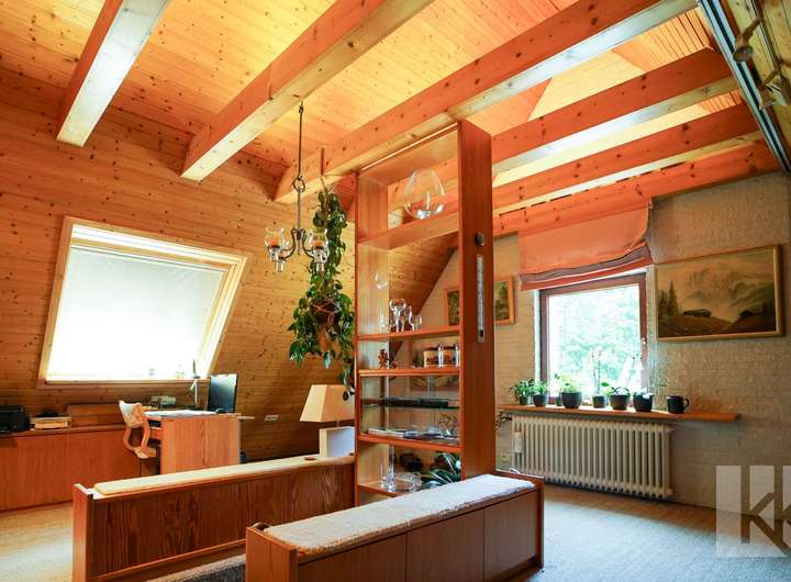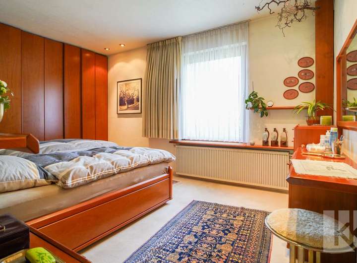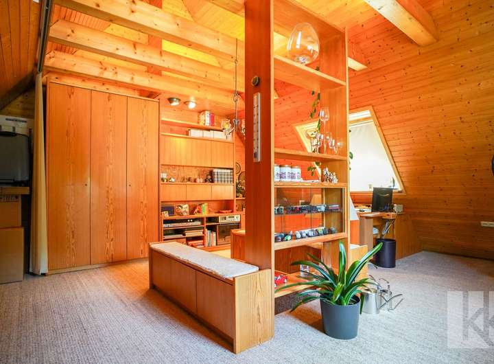 Im Obergeschoss befinden sich zwei Zimmer: das geräumige Schlafzimmer mit praktischem Einbauschrank sowie ein weiteres, individuell nutzbares Zimmer – perfekt z. B. als Kinder- oder Arbeitszimmer. Von hier aus führt eine Treppe ins ausgebaute Dachgeschoss, das mit seinem wohnlichen Charakter weitere Möglichkeiten bietet – etwa als Rückzugsort für Gäste, als Hobbyraum oder gemütliches Atelier.