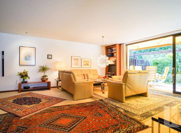 Schon beim Betreten empfängt Sie der offen gestaltete Eingangsbereich mit Garderobe – einladend und großzügig. Direkt anschließend öffnet sich der lichtdurchflutete Wohn- und Essbereich, der dank des Anbaus besonders weitläufig wirkt. Große Fensterflächen geben den Blick frei auf den farbenfrohen Garten und lassen den Raum fast mit der umliegenden Natur verschmelzen. Hier scheint die Hektik des Alltags in weiter Ferne.