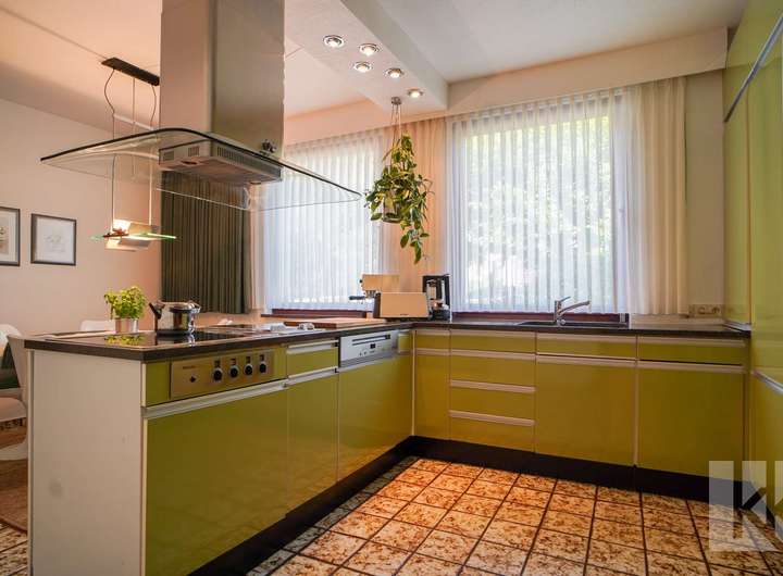 Die gepflegte, nostalgische Einbauküche schließt direkt an den Essbereich an und lädt zu geselligen Kochabenden ein – ein Ort voller Atmosphäre, in dem man sich sofort zu Hause fühlt.