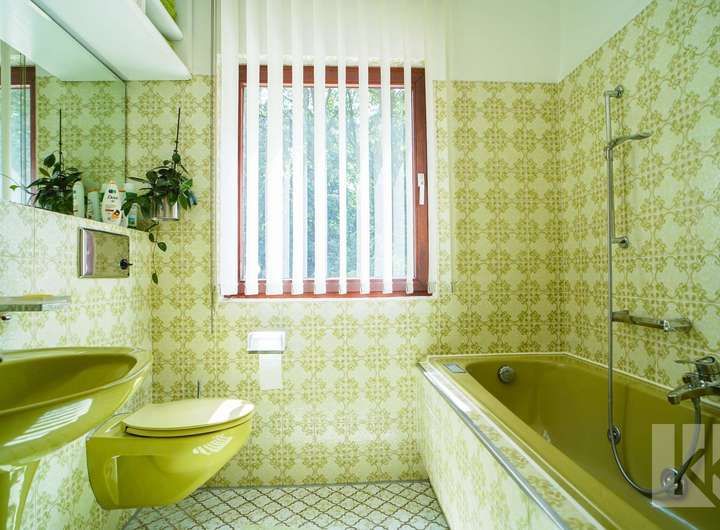 Ein Badezimmer mit Tageslicht in frischem Hellgrün ergänzt das Raumangebot im Obergeschoss und sorgt für eine angenehm wohnliche Atmosphäre.