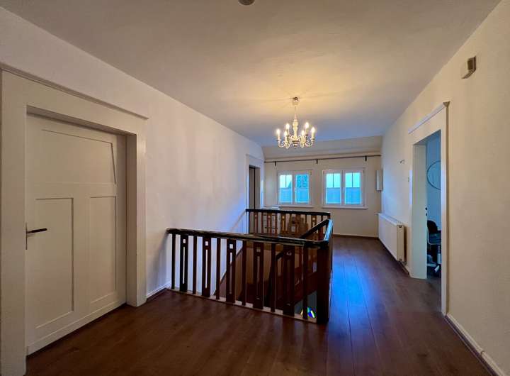 Über die historische Holztreppe gelangt man ins Obergeschoss. Hier stehen drei Schlafzimmer, ein Tageslichtbad sowie ein separates Büro zur Verfügung – perfekt für konzentriertes Arbeiten im Homeoffice oder als Rückzugsraum.