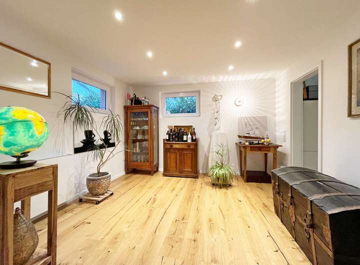 Das Untergeschoss bietet zusätzlich nützliche Räume. Hier finden Sie neben einer großzügigen Lagerfläche auch einen Waschraum sowie ein modernes Badezimmer, das vor wenigen Jahren neu eingebaut wurde und Zugang zur Sauna (aktuell außer Betrieb) bietet. Zudem haben Sie vom Kellergeschoss aus Zugang zur Garage.