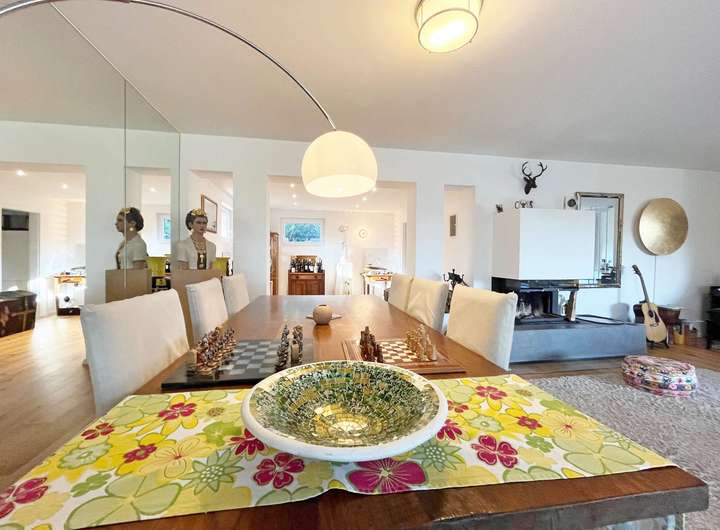 Bereits beim Betreten des Hauses empfängt Sie eine einladende Diele. Von hier aus gelangen Sie auf der linken Seite in das großzügige Wohn- und Esszimmer mit einer Fläche von ca. 45 m². Der Raum bietet ausreichend Platz, um sich individuell nach den eigenen Vorstellungen einzurichten und besticht durch eine angenehme Atmosphäre, die durch den hochwertigen Parkettboden, den Blick in den Garten und den vor knapp zwei Jahren eingebauten Kamin zusätzlich unterstrichen wird.
