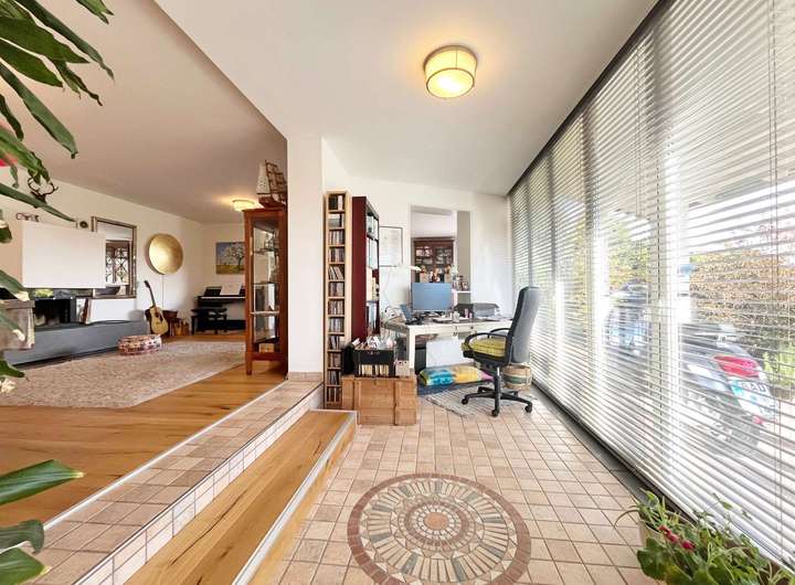 Der Wintergarten, welcher an das Wohnzimmer anschließt, bietet eine zusätzliche Nutzfläche. Ob als Arbeitsbereich oder Lesezimmer – der Wintergarten ist ein vielseitiger Raum, der durch seine Helligkeit und den direkten Zugang zum Garten und den beiden Terrassen punktet.