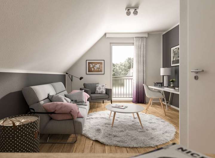 Treten Sie ein in Ihre neue Wohlfühloase. Durch die helle Diele geht es in das weitläufige Wohnzimmer mit großem Essbereich. Es ist ein absoluter Anziehungspunkt für die ganze Familie und Ihre Gäste. Drei große Fenster machen den Wohnbereich besonders hell und freundlich, der Blick in den Garten rundet die angenehme Atmosphäre ab. Auch die Küche bietet Ihnen viel Platz für das gemeinsame Kochen mit den Kindern oder Freunden. Die drei geräumigen Zimmer im Obergeschoss bieten genug Platz zur persönlichen Entfaltung. Die beiden Zimmer in den Garten sind durch die Gaube besonders hell und bieten viele Möglichkeiten der Einrichtung. Dieses Haus besitzt nicht nur Charakter und einen besonderen Charme, es ist obendrein äußerst flexibel. Für große Familien können 5 oder 6 Zimmer eingeplant werden. Es scheint, als hätte das Flair 125 für jeden Wunsch seiner zukünftigen Bewohner genau die richtige Grundrissvariante parat. Auch das Hausdesign ist wandlungsfähig (moderner oder süddeutscher Stil) und überzeugt durch einen stilvollen sowie praktischen Eingangsbereich und eine wunderschöne Ansicht aus dem eigenen Garten.