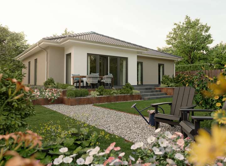 Er bietet ein gemütliches Wohnzimmer mit Essbereich, ein geräumiges Schlafzimmer und zwei weitere Zimmer. Alle Räume sind dank großer Fenster hell und freundlich. Mit quasi einem Schritt sind Sie mit Ihren Liebsten im Garten und können die Sommerzeit bei einem Grillabend genießen. Das schöne Walmdach gibt dem Bungalow seinen Charakter. Der Bungalow 110 ist ein perfekter Ort für Menschen, die die gegenseitige Nähe lieben und zugleich ihren individuellen Platz schätzen.