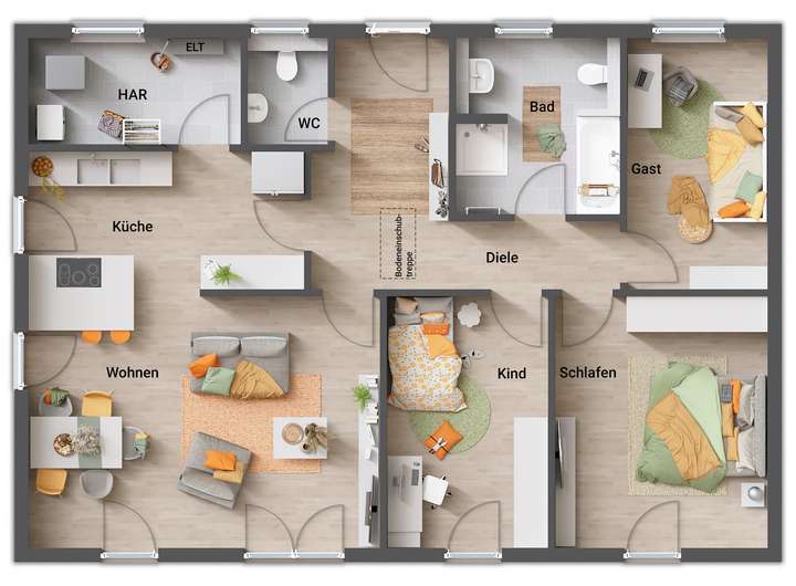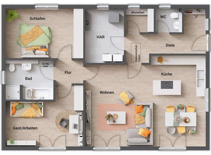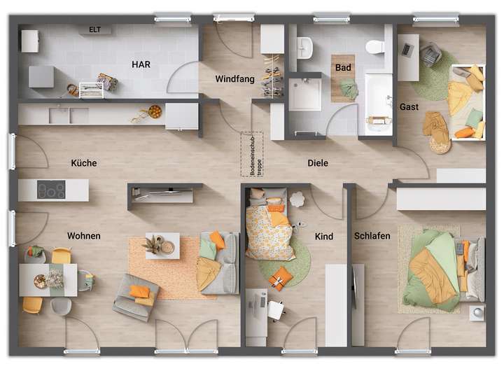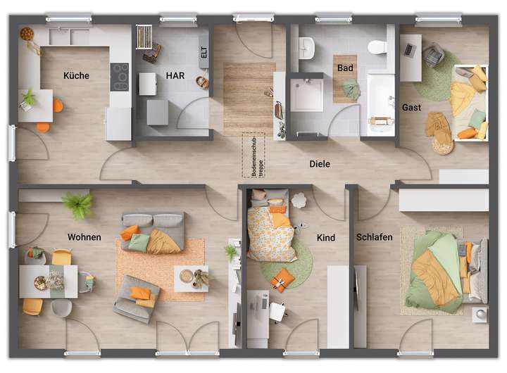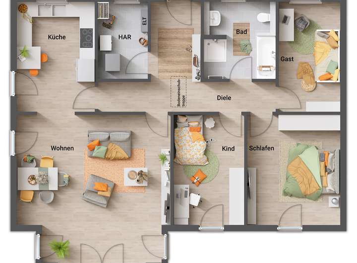 • Fußbodenheizung: Warme Füße? Auch die Fußbodenheizung ist inklusive. Sie steigert nicht nur den Wert Ihres Hauses, sondern sorgt ganz nebenbei noch für echtes Wohngefühl.