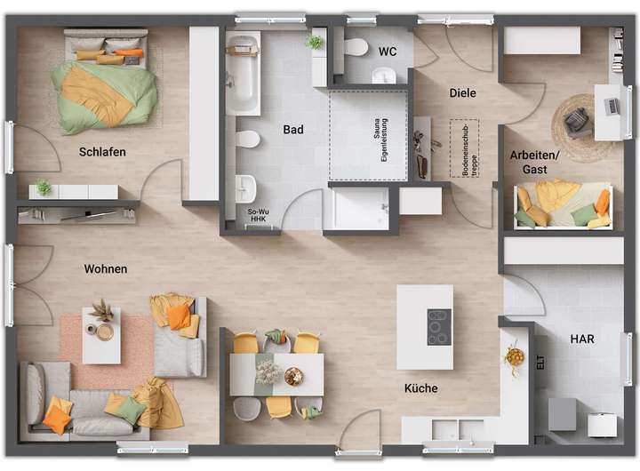 - auf Wunsch kann ein Gäste-WC im Grundriss integriert werden