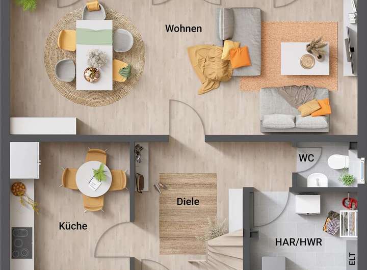 Das Flair 113 ist nicht ohne Grund das meistgekaufte Town & Country Haus. Es bietet alles, was ein Massivhaus gemütlich macht. Im Erdgeschoss betreten Sie ein komfortables, geräumiges Wohn- und Esszimmer, eine Küche mit genügend Freiraum, ein Gäste-WC und einen Hauswirtschaftsraum mit ausreichend Platz für Waschmaschine und Co. Im Dachgeschoss erwarten Sie neben drei weiteren geräumigen Zimmern ein komfortabel ausgestattetes Badezimmer.