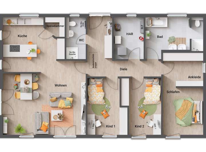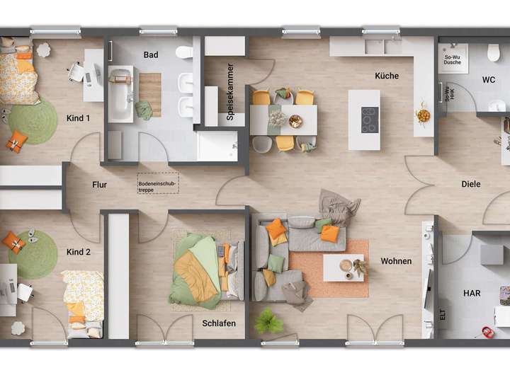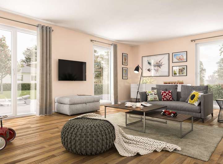 Unser Bungalow 131 hat es in sich – zwei Kinderzimmer, zwei Bäder, Schlafzimmer und Gästezimmer – viel Wohnfläche und clever nutzbarer Stauraum für die ganze Familie. Frühstücken Sie in der großen Wohnküche mit ihren Lieben und planen gemeinsam den Tag. Das traumhafte Wohnzimmer mit seinen großen Fenstern ist der perfekte Ort zum Entspannen, bietet freien Blick in Ihren Garten und mit wenigen Schritten sind Sie auf Ihrer Terrasse im Grünen. Dank bodentiefer Fenster sind die Wohnräume lichtdurchflutet und geben ein besonderes Wohngefühl. Das geräumige Schlafzimmer rundet das Raumangebot ab und machen Ihr Traumhaus zum Begleiter in allen Lebensphasen. Ihr Badezimmer gestalten Sie als Ihre ganz persönliche Wohlfühloase. Das Gäste-WC bietet Platz genug für eine Dusche und entspannt Ihr Zusammenleben.